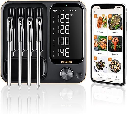 This 4-probe Wifi hermometer is perfect for BBQ masters and kitchen enthusiasts. Unlimited range via WiFi and Bluetooth 5.3, IPX8 waterproof, and a 360° readable LCD base – what’s not to love? Monitor temps remotely, set alerts, and enjoy perfectly cooked food every time. Highly recommended