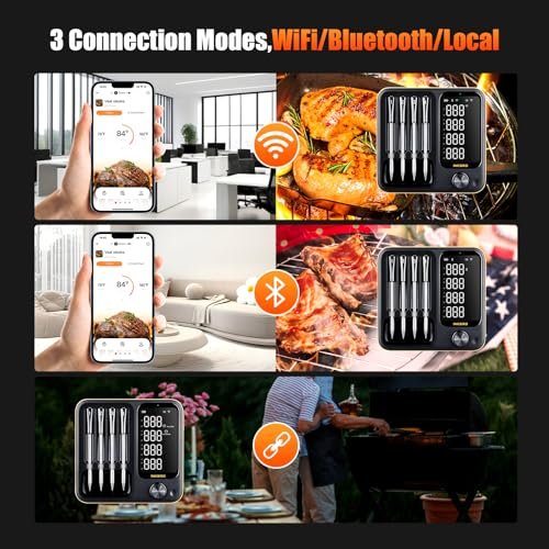 Grilling just got smarter This 4-probe thermometer takes the guesswork out of cooking The WiFi and Bluetooth connectivity let me monitor temps from anywhere and the waterproof design’m perfect for busy kitchens The 360° LCD base is super handy too highly recommend for serious grillers