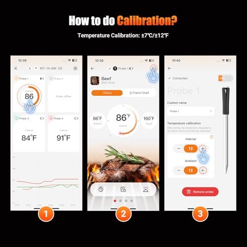 - Calibration±12℉ To Make Sure Correct Temperature: Please remember do calibration when temperature is off when using. That make sure always get correct reading. The internal temperature range is from 14~212℉, while the cooking environment temperature range is from 32~572℉. Each probe has an amazingly high measurement accuracy of ±1.8℉, which is perfect for helping you control the food temperature precisely at what you want.(NOTE: It’s important to keep all probes within 19.68ft of the base for a stable connection. Plus, make sure you insert each probe deep enough and beyond the safe cooking line for the best results)