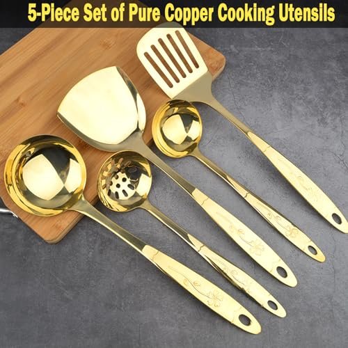 5-Piece Pure Copper Kitchen Cooking Utensils Set, Stylish Copper Kitchen Accessories, Cookware Set for Home or Restaurant Cooking (Brass)