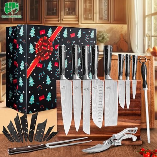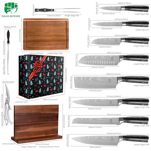 | Included Components | 1 Magnetic Knife Block Holder, 8" Chef Knife, 8" Slicer Knife, 8" Bread Knife, 7" Santoku Knife, 5" Santoku Knife, 7" Cleaver Knife, 5"universal knife, and 3.5" Paring Knife. ,1 Cutting Boards,1 kitchen Scissors,1 sharpening rod,1 turkey fork |