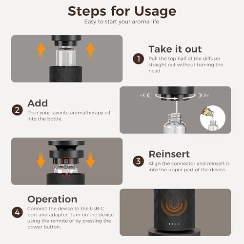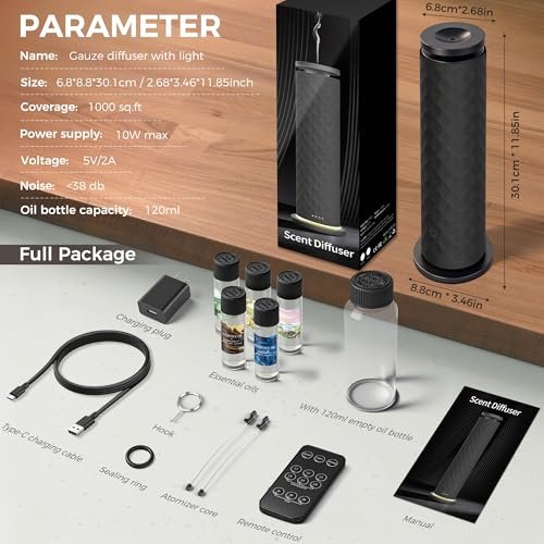 - Waterless Scent Diffuser Starter Kit: This waterless scent diffuser kit includes a waterless diffuser, a 120ml essential oil bottle, 5 sample bottles of essential oils, a remote control, a USB charging cable, a power adapter, 2 replaceable coils, and a user manual. These scent diffusers for home allow you to easily and elegantly enjoy the fragrance of essential oils.